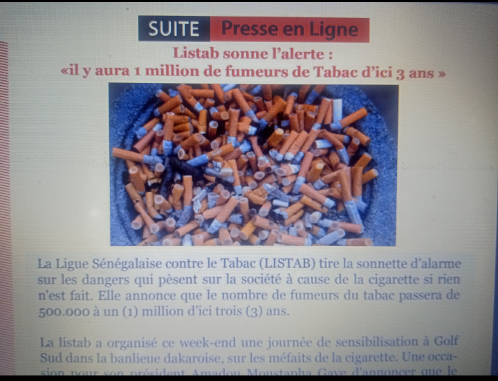 Les chiffres sur le tabagisme sont été confirmés par la Ligue Sénégalaise contre le Tabac (LISTAB). Dans un document consulté par PressAfrik et publié le 28 mai 2018, son président Amadou Moustapha Gaye avait annoncé que le nombre de fumeurs va augmenter d’ici trois (3) ans pour atteindre la barre du million.