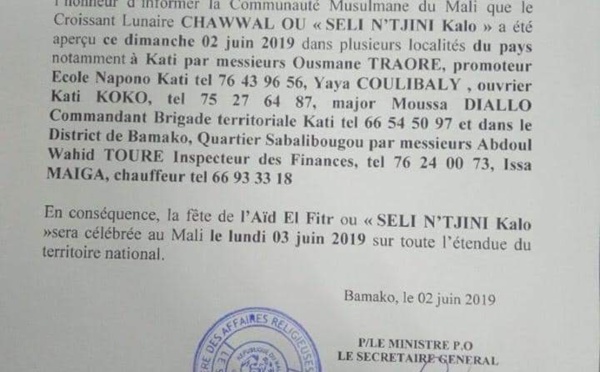La communauté musulmane du Mali va fêter l’Eid El Fitr ce lundi 3 juin 2019, après que leur Commission d’observation du croissant lunaire a déclaré avoir aperçu ce dernier dans plusieurs endroits du pays. Pour rappel, une partie de la communauté musulmane malienne avait commencé le Ramadan le dimanche 5 mai et en est donc a...