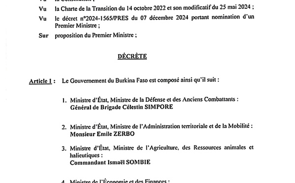 Vingt-quatre seulement après la nomination de Rimtalba Jean Emmanuel Ouedraogo au poste de Premier ministre, la composition du nouveau gouvernement burkinabè a été annoncée, dimanche 8 décembre. Fort de 24 membres, il est marqué par l'arrivée de plusieurs nouvelles personnalités à des ministères clés mais aussi par le départ de...