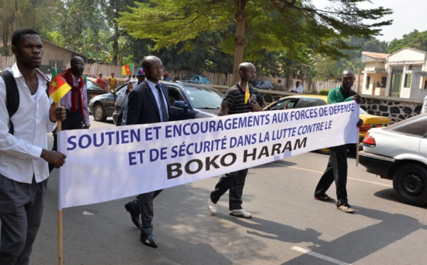 Depuis quelques semaines, les marches de soutien à l’armée et à la nation fleurissent au Cameroun. Les populations se mobilisent contre Boko Haram. Illustration à Yaoundé samedi 7 février 2015. Les musiciens égrainent leurs notes joyeuses dans les rues de Yaoundé.« Folklore classique », c’est le nom de cette fanfare...