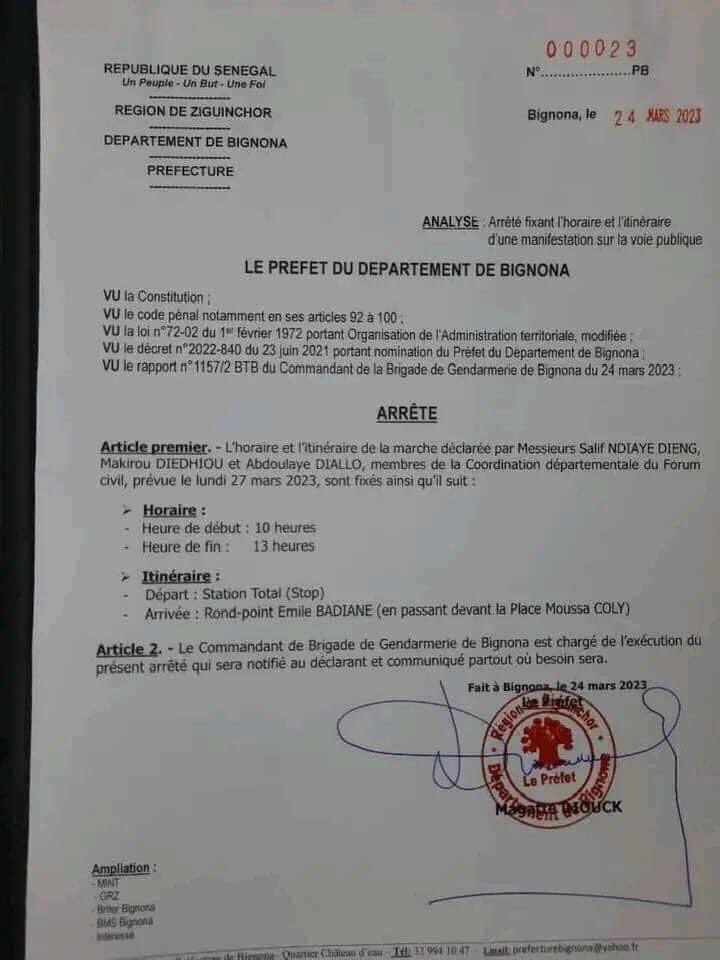 La Société civile a déclaré à l’autorité préfectorale de Bignona marche pacifique pour protester contre la répression meurtrière des manifestations dans cette partie du pays. Ce après la mort, vendredi dernier, du jeune Mamadou Korka Ba, tué par balle, lors de la manifestation des militants de Pastef pour exiger la libération de leurs camarades arrêtés la veille.