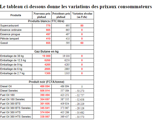 Le Super va passer de 695 Fcfa à 775 Fcfa, soit 80 Fcfa de plus. Quant Gasoil va passer 595 Fcfa à 655 Fcfa, soit 60 Fcfa de plus.
