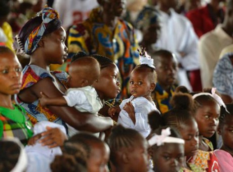 Bien plus d'un millier de fidèles sont arrivés parés de leurs plus beaux atours : maillots de foot ou pagnes, parfois à l'effigie du pape ou de la vierge Marie.