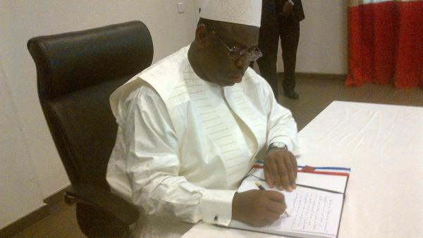 Dans la salle des droits de l’homme où l’on célèbre les mariages, un registre est posé sur la table. Le président sénégalais Macky Sall écrit ces quelques mots : « Je présente mes condoléances émues au peuple ami et au gouvernement français suite aux attentats barbares contre Charlie Hebdo et les populations civiles innocentes à Paris. Le Sénégal par ma voix réaffirme son engagement et sa détermination sans faille dans la lutte contre le terrorisme international ».