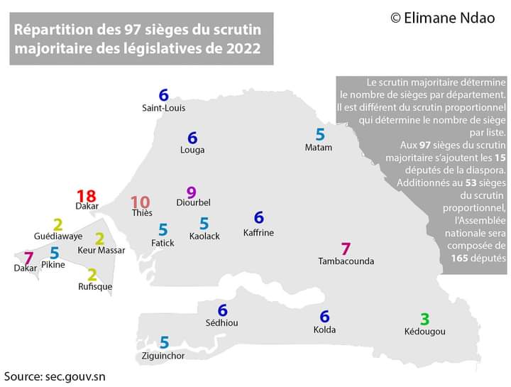 Ceci est (voir photo) la répartition des députés du scrutin majoritaire des législatives 2022 par région. Par rapport aux législatives de 2017, il y a 7 députés supplémentaires qui ont été ajoutés à ce scrutin. 4 dans la région de Thies, 1 à Dakar, 1 à Sedhiou et 1 à Kolda, à cause de l'augmentation de la population électorale dans ces régions.