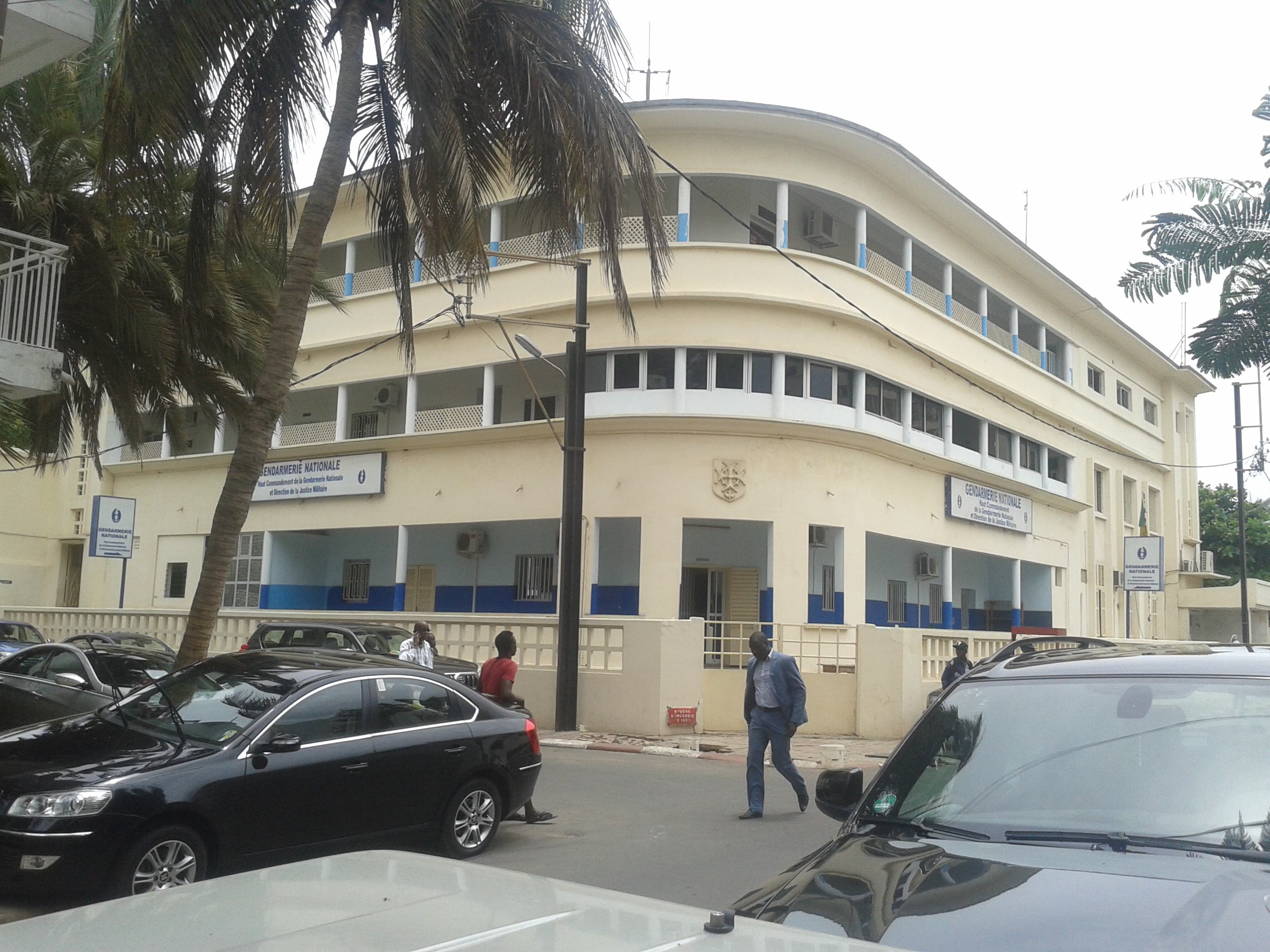 Rue Joseph Gomis X Emile Zola. L’humidité, diluée dans les faibles rayons du soleil produit une lourde chaleur, de mise dans les pays tropicaux, en cette période de l'année. Un temps qui ne semble pas trop avoir d’impact sur l’affluence habituelle de la rue. Une imposante bâtisse de type colonial classée patrimoine mondial trône royalement sur ces lieux et fait la différence. Il abrite le Haut Commandement de la Gendarmerie Nationale, Direction de la Justice Militaire.