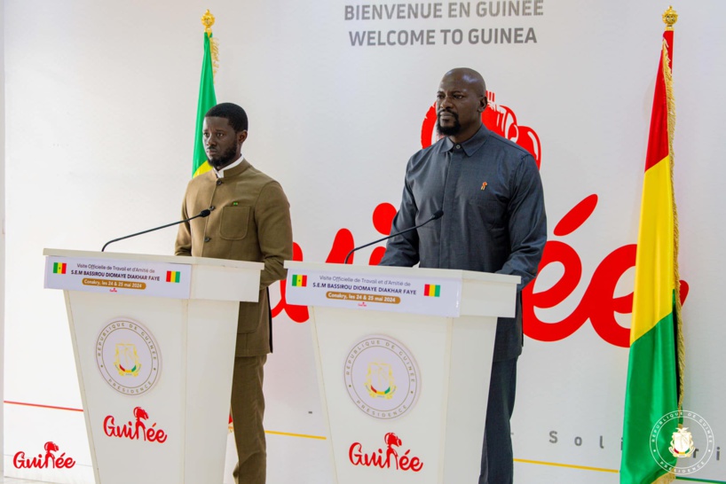 « À l’invitation de son frère et ami, Son Excellence le général de corps d’Armée Mamadi Doumbouya, président de la République de Guinée, le chef de l’Etat, Son Excellence Monsieur Bassirou Diomaye Diakhar Faye, président de la République du Sénégal à la tête d’une importante délégation, a effectué une visite de travail et d’amitié à Conakry, du 24 au 25 mai 2024. Cette visite s’inscrit dans le cadre du renforcement des relations traditionnelles d’amitié et de coopération qui existent entre les deux pays », rapporte le communiqué conjoint parvenu à PressAfrik.