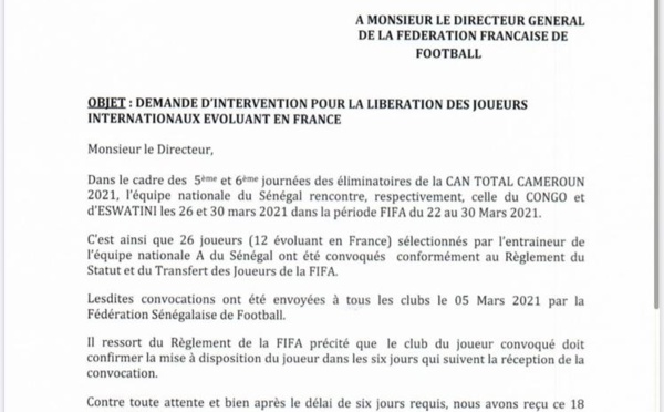La Fédération Sénégalaise de Football (FSF), dans un communiqué paru ce jeudi soir, a sollicité l’intervention de son homologue française pour la libération des joueurs internationaux sénégalais évoluant dans le championnat français de Ligue 1 et Ligue 2. En effet, depuis hier mercredi, la Ligue de Football Professionnel (LFP)...