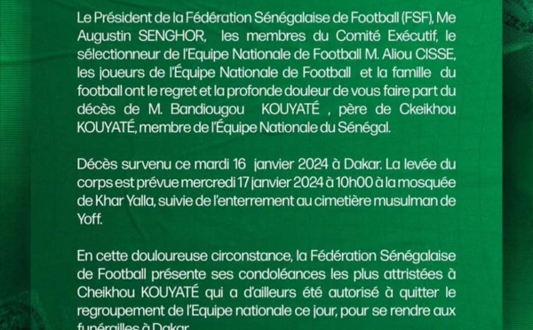 La Fédération Sénégalaise de Football qui présente ses condoléances les plus attristées à Cheikhou Koiyaté, autorise le joueur à quitter le regroupement de l'Equipe nationale ce mardi, pour se rendre aux funérailles à Dakar.