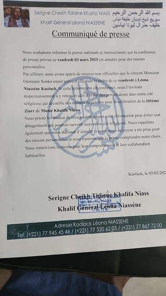 La raison évoquée par le Khalife Cheikh Tidiane Khalifa Niass est "d'éviter des perturbations dans la cité religieuse qui accueille des milliers de pèlerins pour la célébration de la 101éme Ziarr de Mame Khalifa Niass", lit -on dans le communiqué.