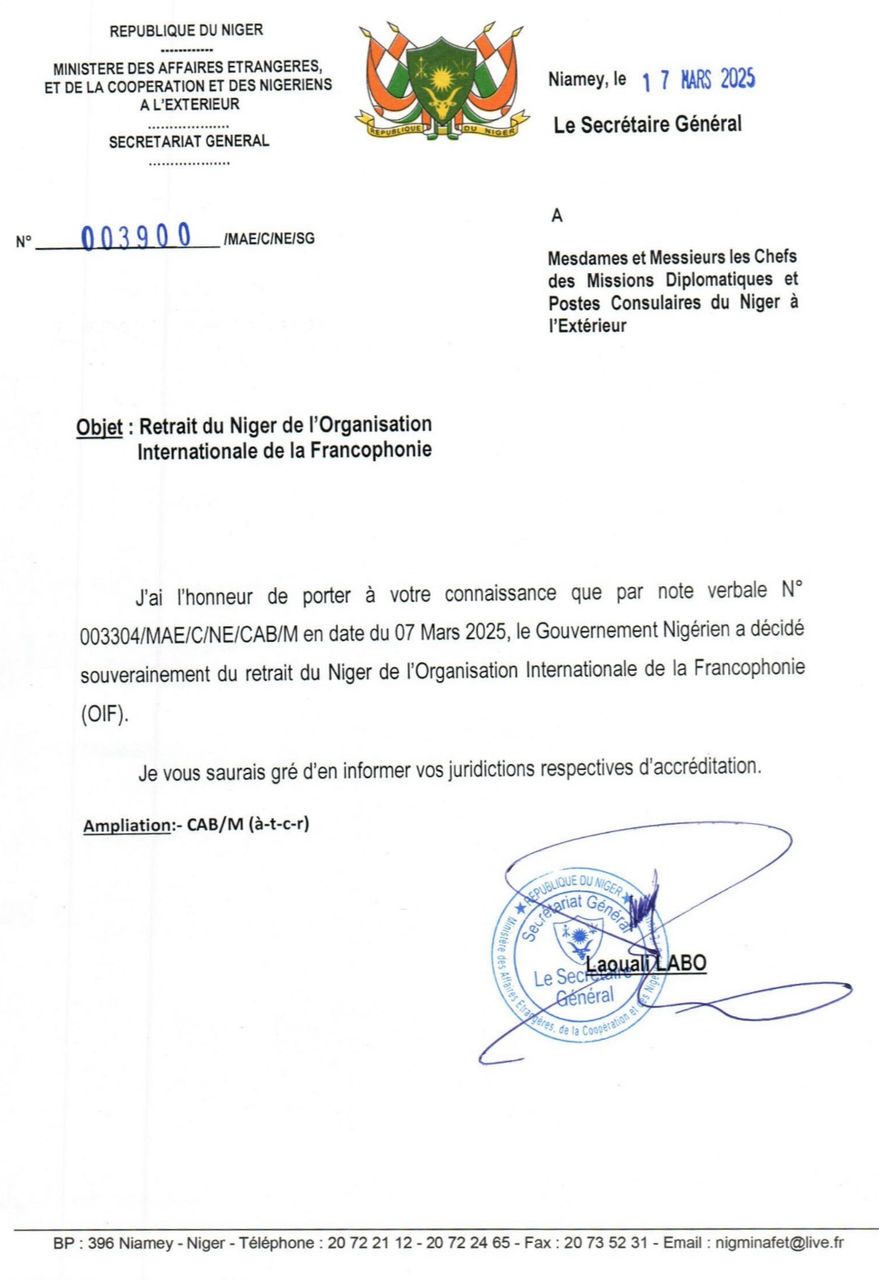 La lettre officielle précise : "J'ai l'honneur de porter à votre connaissance que, par note verbale N° 003304/MAE/C/NE/CAB/M en date du 07 Mars 2025, le Gouvernement Nigérien a décidé souverainement du retrait du Niger de l'Organisation Internationale de la Francophonie (OIF). Je vous saurais gré d'en informer vos juridictions respectives d'accréditation."