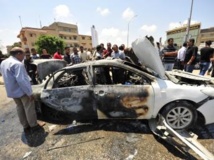 Le 6 août, à Benghazi, des passants entourent la carcasse d’une voiture détruite après l’explosion d’une bombe qu’elle transportait, tuant le conducteur. REUTERS/ Esam Omran Al-Fetori