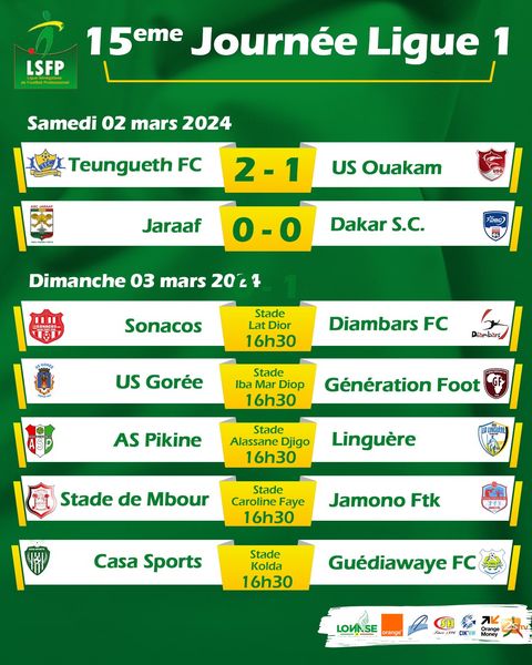 Leader du championnat, Teungueth FC va garder sa première place après sa victoire renversante 2-1 ce samedi face à l’US Ouakam. Le Jaraaf de Dakar a été tenu en échec par Dakar Sacré Cœur pour le compte de la 15e journée de Ligue 1.