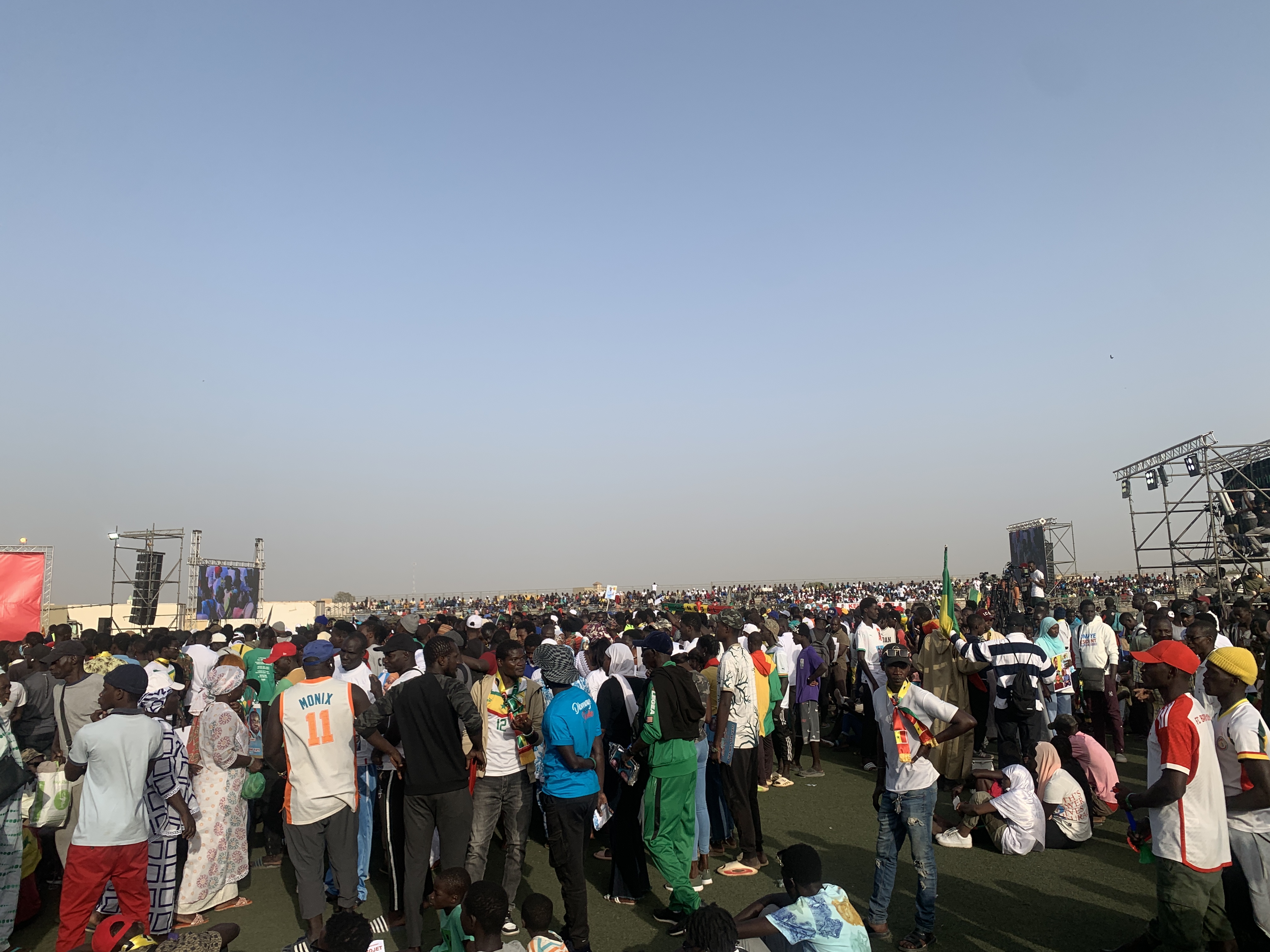 Devant l’entrée du stade, des stands de vente de t-shirts, de sifflets, de banderoles, (…) sont exposés et vendus aux personnes qui viennent. Les gradins et la pelouse refusent déjà du monde et les leaders et responsables de partis arrivent petit à petit.