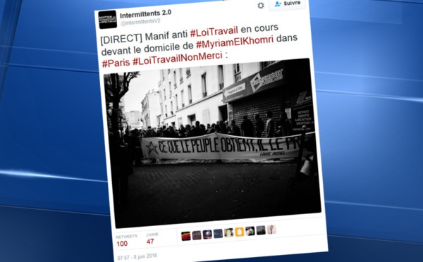 SOCIAL - Une vingtaine d'intermittents du spectacle a brièvement manifesté, mercredi 8 juin, devant le domicile de la ministre du Travail Myriam El Khomri dans le 18ème à Paris pour réclamer l'application de l'accord sur leur régime d'indemnisation chômage. Les militants de la Coordination des intermittents d'Ile-de-France...