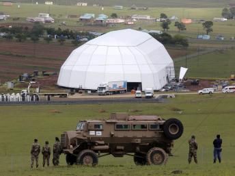 « Les caméras ne sont pas autorisées ici. Pas de journalistes ici. Vous devez aller là-bas, vers cette tente. C’est pour des raisons de sécurité. Tous les journalistes ne sont pas autorisés à aller plus loin », explique une policière à l’entrée du village. La presse n’aura donc pas accès à la cérémonie de dimanche. Les médias sont parqués à côté du musée Nelson-Mandela, sur la colline en face du cimetière où sera enterré l’ancien président. Le chapiteau qui va accueillir environ 5 000 personnes a déjà été monté, des camions continuent d’y arriver. Les journalistes du monde entier qui commencent à affluer à Qunu et dans les environs devraient donc être réunis sous deux tentes à plus d’un kilomètre du lieu de la cérémonie. Sauf la SABC, la télévision nationale.