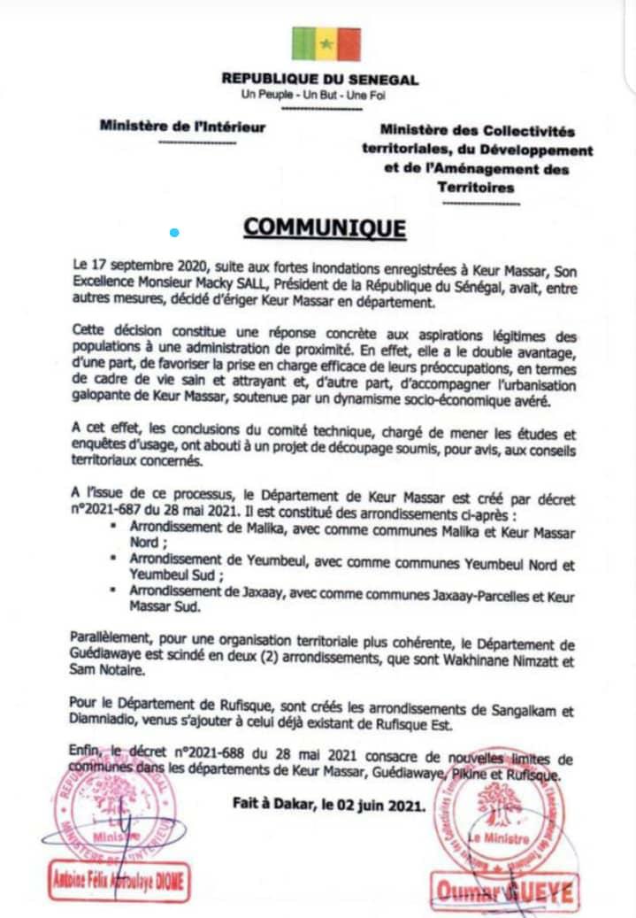 Parallèlement, pour une organisation territoriale plus cohérente, rapporte un communiqué parvenu à PressAfrk, le département de Guédiawaye est scindé en deux (2) arrondissements que sont Wakhinane Nimzatt et Sam Notaire.