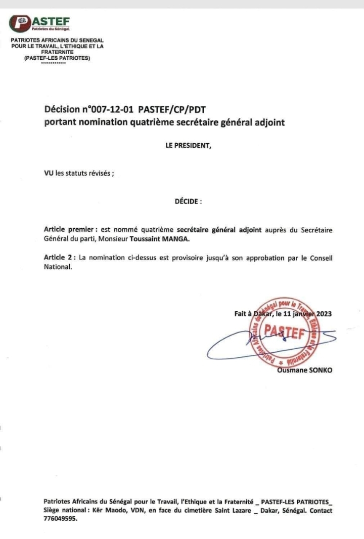 L'ancien député libéral Toussaint Manga qui a rallié le Pastef, le mois de novembre dernier vient d’être nommé provisoirement au poste de quatrième Secrétaire Général Adjoint auprès du Secrétaire Général du parti. Le communiqué de Pastef précise que cette nomination est "provisoire jusqu'à son approbation par le conseil national."