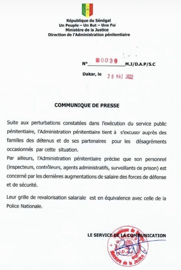 « Suite aux perturbations constatées dans l’exécution du service public pénitentiaire, l’Administration pénitentiaire tient à s’excuser auprès des familles des détenus et de ses partenaires pour les désagréments occasionnés par cette situation », a indiqué le document tout en rassurant le personnel pénitentiaire.