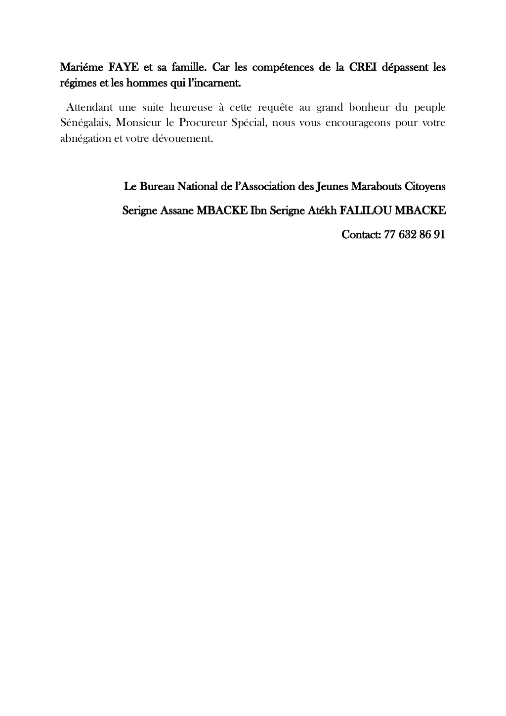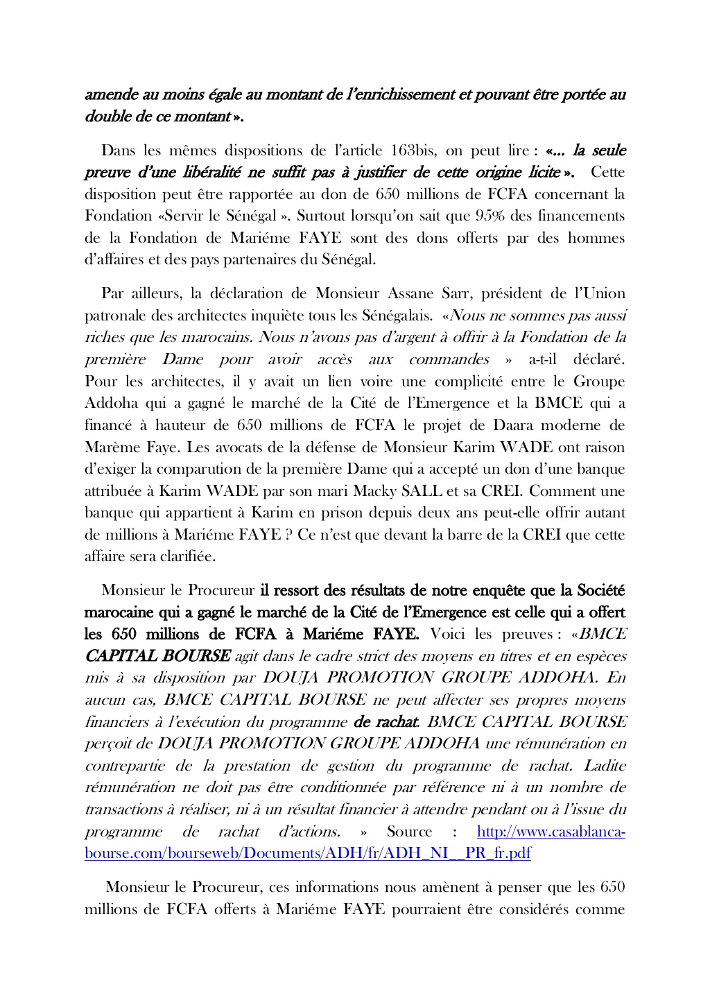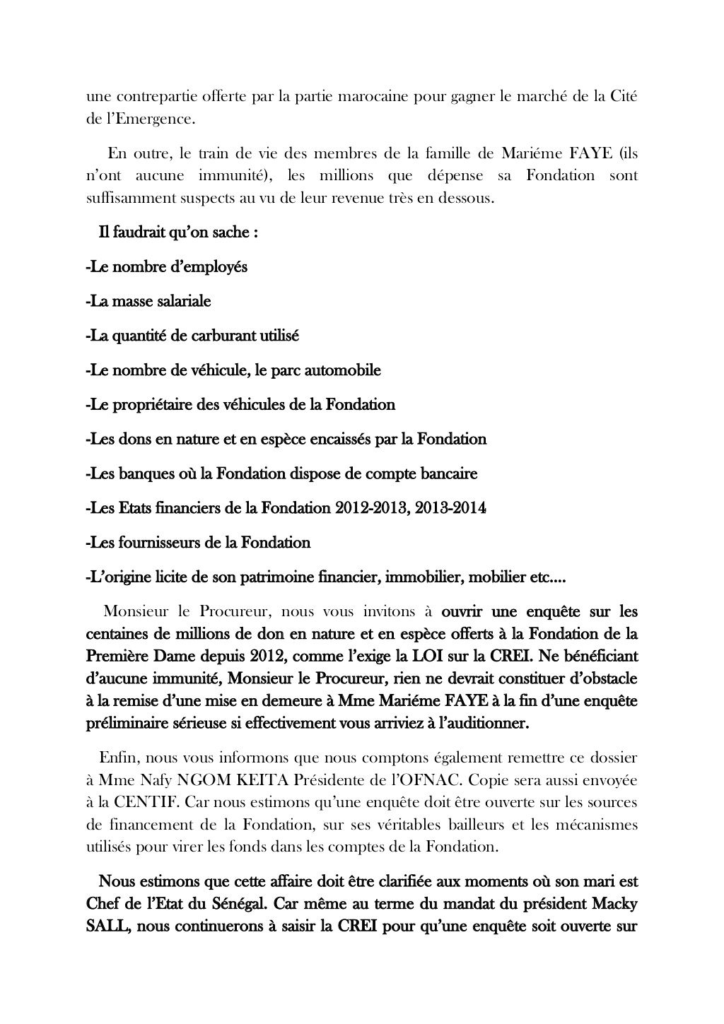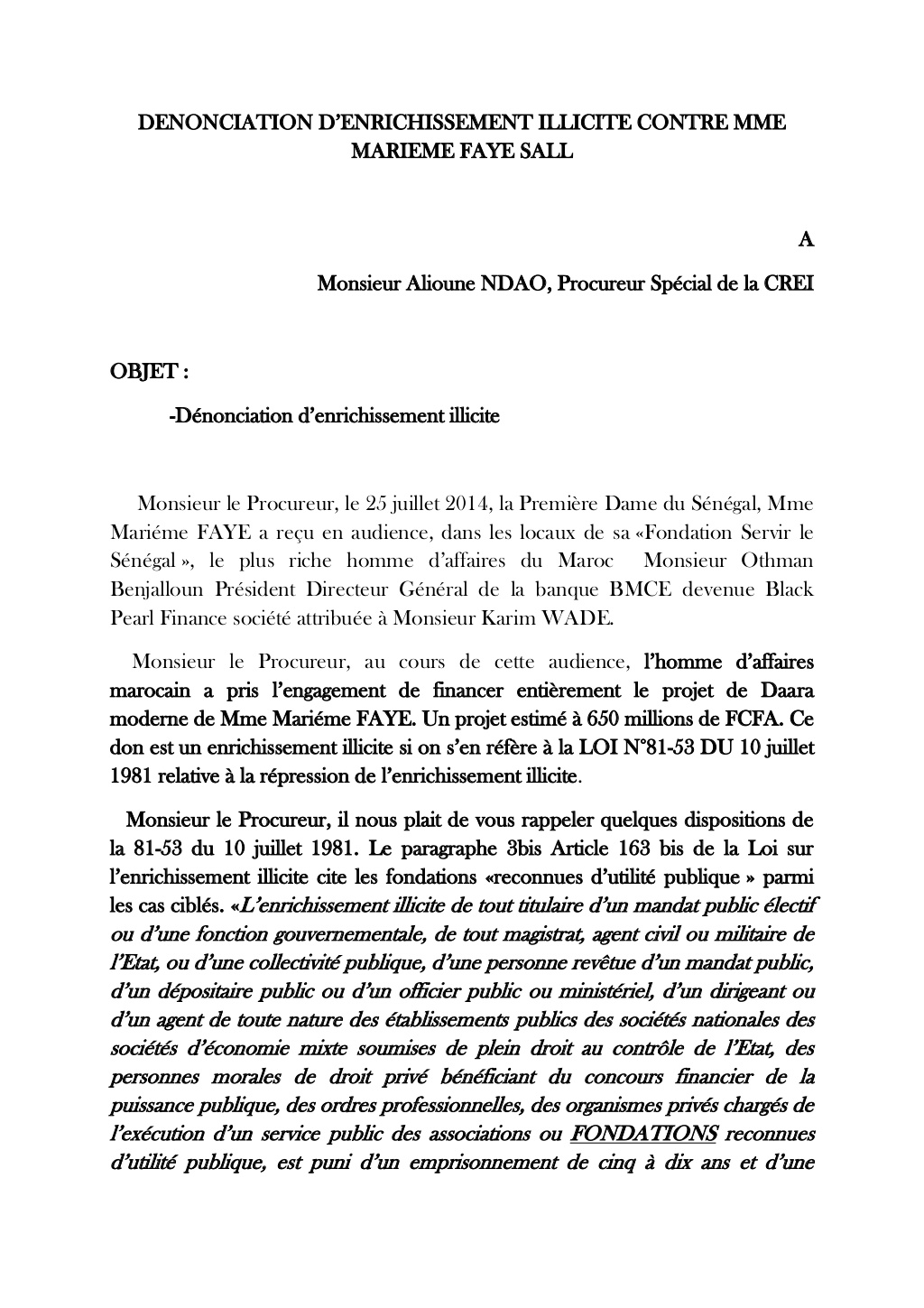 La traque des biens dits mal acquis prend une autre tournure. La première dame aux bancs des accusés. Les avocats de Karim Wade ont annoncé la couleur jeudi dernier en la citant à témoin dans le procès du siècle, pour 650 millions de F CFA que Marème Faye Sall aurait eu comme financement au niveau de Black Pearl Finances, une des sociétés dans le dossier contre Wade-fils. Le bureau national de l'associations des jeunes marabouts citoyens passent à l'action ce lundi. Serigne Assane Mbacké Ibn Serigne Atékh Falilou Mbacké compte se rendre à la Cour de Répression de l'Enrichissement Illicite (CREI) pas plus tard que ce matin pour déposer une plainte. Ils invoquent la loi n°81-53 du 10 juillet 1981 pour inviter le Procureur spécial, Alioune Ndao à sévir. Documents en pièces jointes.