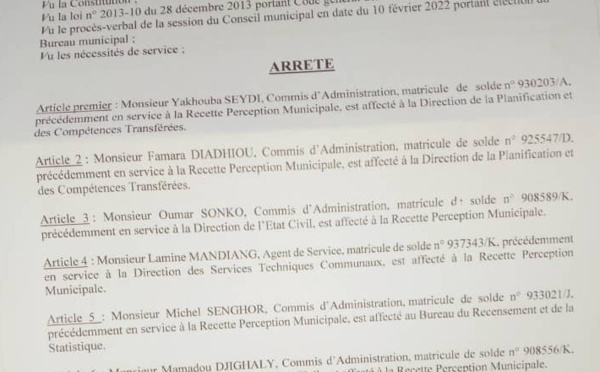 Des changements ont été opérés ce mercredi à la mairie de Ziguinchor (sud) où des agents étaient en grève depuis plusieurs. Le maire Ousmane Sonko a affecté une vingtaine d'agents dont la plus part font partie des grévistes. Sur l'arrêté d'affectation, l'on peut constater que les agents en poste à la direction de...