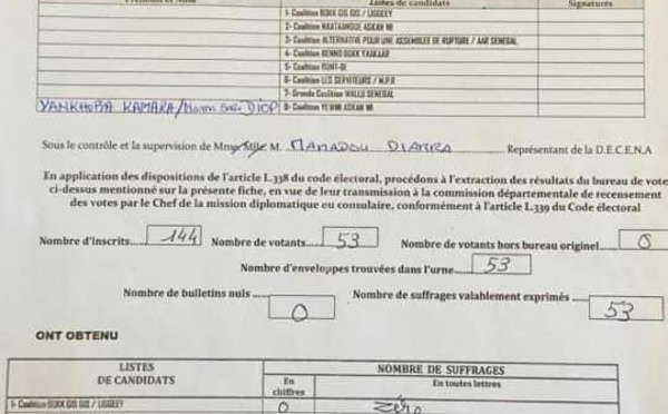 Les premiers résultats tombent à l’extérieur. À Montpellier, le dépouillement bureau 2 Nombre d’inscrits: 144 Nombre de Votants: 53 YAW: 51 Benno: 2 À Ankara (Turquie), la grande coalition Wallu Sénégal l’emporte avec 44 voix contre 11 pour YAW et 10 pour BBY.