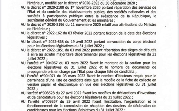 Le Ministre Antoine DIOM a pris le 30 mai 2022, un arrêté déclarant que la liste des titulaires de YEWWI ASKAN WI au scrutin proportionnel n’est pas recevable, au motif principal qu’elle serait incomplète, au regard des dispositions de l’alinéa 1 de l’’article L.178 du code électoral. Dans sa décision n°1/E/2001 du 23 mars...