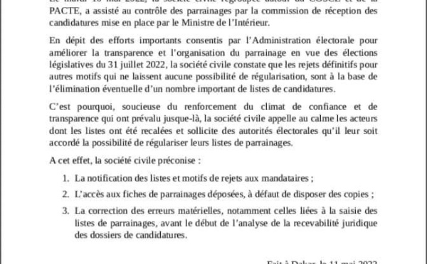 La société civile regroupée autour du Cosce (Collectif des organisations de la société civile pour les élections) constate des rejets définitifs de certaines listes de parrainages qui ne laissent aucune possibilité de régularisation. "Soucieuse du renforcement du climat de confiance et de transparence qui ont prévalu...