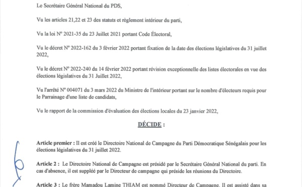 Le secrétaire général du Parti démocratique sénégalais (PDS), Abdoulaye Wade a dévoilé la composition du directoire de son parti en vue des élections législatives de juillet 2022. Plusieurs cadres de la formation politique y figurent (document) C’est l’ancien député Mamadou Lamine THIAM qui est nommé Directeur de Campagne et...