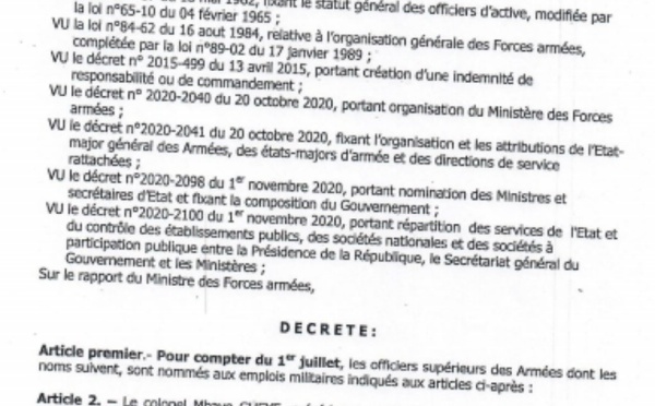Le chef de l’État a opéré un vaste chambardement dans les rangs des officiers supérieurs de l’armée sénégalaise. Entre nominations et mutations, au total 50 officiers supérieurs ont été nommés à des emplois supérieurs, rapporte le quotidien national Le Soleil. (voir documents)