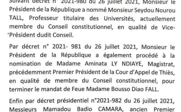 Le Conseil constitutionnel va enfin pouvoir siéger avec 7 sages. Dans un communiqué publié par le ministère de la Justice ce mardi, il est notifié à l’opinion publique que le chef de l’Etat Macky a, par décrets nommé 3 nouveaux juges au Conseil constitutionnel. Il s’agit de Madame Adama Ly Ndiaye, Magistrat et précédemment...
