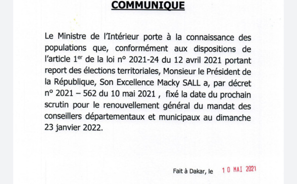 La dates des élections locales est maintenant connue. Le Ministre de l'Intérieur porte à la connaissance des populations que, conformément aux dispositions de l'article 1er de la loi n° 2021-24 du 12 avril 2021 portant report des élections territoriales, le Président de la République, Macky SALL a, par décret nº 2021 - 562 du...