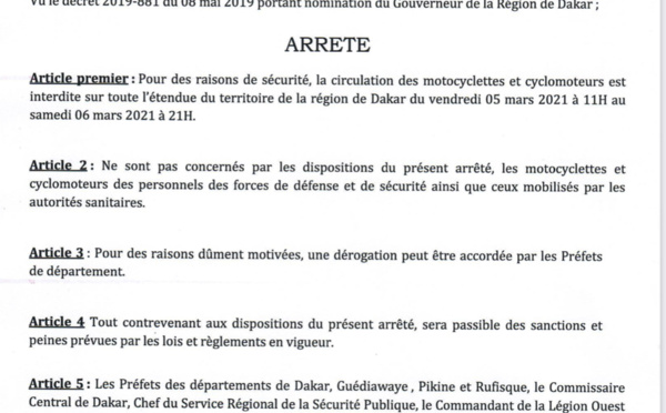 La circulation des motocyclettes et cyclomoteurs est interdite sur I'étendue du territoire régional du vendredi 05 mars 2021 a 11H au samedi 06 mars 2021 a 21H. Cette information émane d’un communiqué du gouverneur de Dakar qui a signé un arrêté dans ce sens. Cette décision a été prise pour des «raisons de...