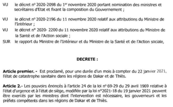 D’aucuns se demandaient si le couvre-feu allait prendre fin ce mardi 26 janvier après l’expiration des arrêtés des Gouverneurs de Thiès et Dakar. Les services de la Présidence viennent de sortir un décret du chef de l’Etat daté du 22 janvier proclamant l’état de catastrophe sanitaire et un couvre-feu pour un mois à compter de...