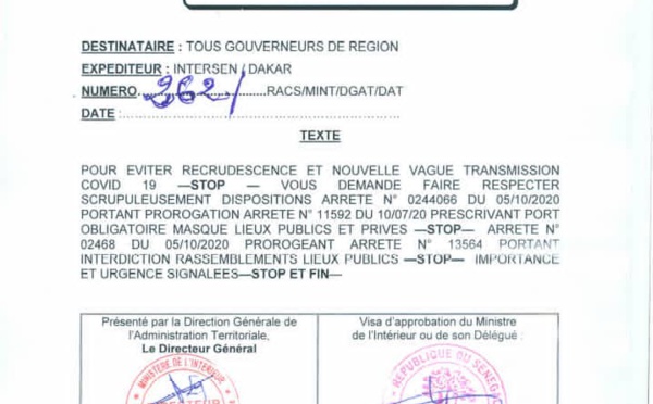 Le ministère de l’Intérieur a envoyé une note à tous les Gouverneurs de région pour leur demander de prendre toutes les dispositions nécessaires afin de faire respecter le port obligatoire de masques dans les lieux publics, privés. Et aussi d’interdire tous les rassemblements dans les lieux publics. Ce dans l’optique de contrer...