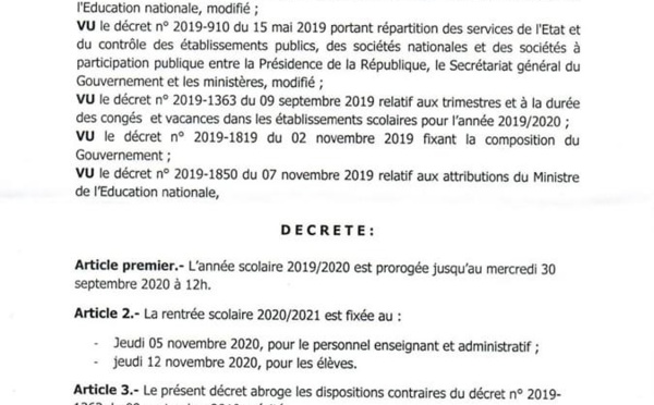 Le président de la République Macky Sall a, via le décret 2020-1487, prolongé l’année scolaire jusqu’au 30 septembre 2020 à 12 heures. Le même document a fixé la rentrée scolaire 2020/2021 au 05 novembre 2020 pour le personnel enseignant et administratif, et au 12 novembre pour les élèves. Ces réaménagement s’expliquent par...