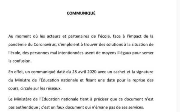 Un faux communiqué annonçant la reprise des activités le 04 mai a été publié sur les réseaux sociaux ce mardi 28 avril 2020. Le ministère de l’Education nationale a produit un autre communiqué pour démentir l’information et annoncer une plainte contre X.