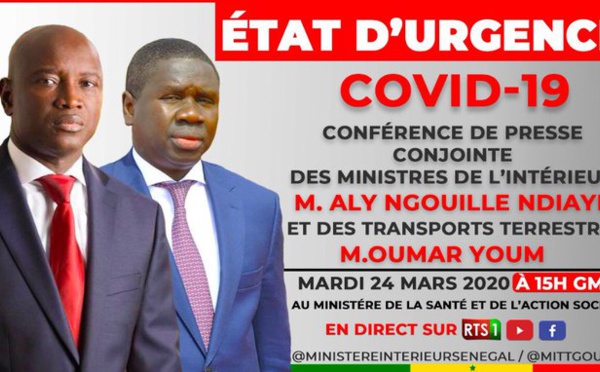 Les ministres de l’Intérieur, Aly Ngouille Ndiaye et des Transports Oumar Youm, tiennent une conférence de presse sur la RTS (télévision publique). Cette rencontre est une occasion pour eux de répondre aux questions sur l’application des mesures de l’état d’urgence prises par le chef de l’Etat, Macky Sall pour lutter contre la...