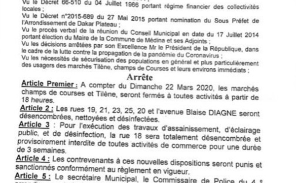 Les mesures d'urgence pour prévenir la propagation de l'épidémie de Coronavirus au Sénégal s'enchaînent, après la déclaration du chef de l'Etat samedi. Dans un arrêté signé par le maire de la Médina Bamba Fall, ce mardi 17 mars, il informe qu’à partir du dimanche 22 mars, les marchés de Tilène et de Champs des courses seront...