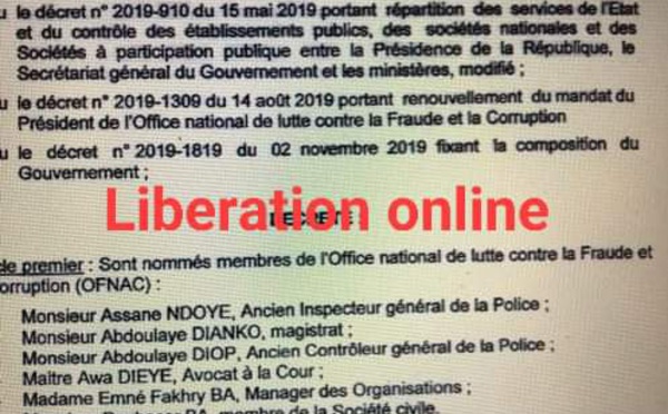 Le Président Macky Sall a sorti un décret pour reconduire Seynabou Ndiaye Diakhaté à la tête de l’Office national de lutte contre la fraude et la corruption (Ofnac). Le même décret de nommer Babacar Ba du Forum du justiciable parmi les six (6) autres membres de l’organe de contrôle.