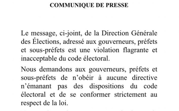La coalition "Idy 2019", a dans un communiqué, dénoncé une violation flagrante du code électoral par la direction la Direction générale des élections et a mis en garde les préfets, sous-préfets et gouverneurs. La coalition a demandé à ses mandataires d'être vigilants et de n'obeir aucune dérogation aux dispositifs du code...
