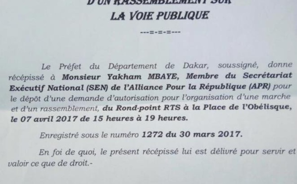 On peut dire que le Secrétaire d’Etat à la Communication ne badine pas. Yakham Mbaye qui entend faire face au mouvement «Y’en a marre», n’a pas tardé à déposer sa demande d’autorisation de marche et de rassemblement le 7 avril prochain sur la Place de la Nation, ex-Obélisque. Ladite demande à peine déposée, le Préfet de Dakar a...