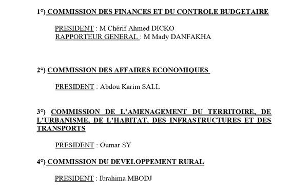 Après son installation, la 15e législature, sous la présidence de Malick Ndiaye, est désormais techniquement prête à s'acquitter de son rôle. Voici la liste des présidents des 14 commissions permanentes.