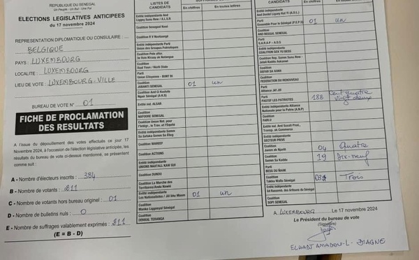 Les résultats des élections législatives sénégalaises au Luxembourg sont tombés. Le parti Pastef arrive largement en tête avec 182 voix. En seconde position, la coalition Samm Sa Kaddu obtient 19 voix, suivie de Jamm Ak Jarign avec 4 voix, Takku-Wallu Sénégal vient en 4e position avec 3 voix. Les coalitions Ensemble...