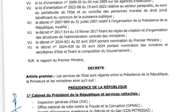 Le Gouvernement sénégalais a officiellement publié un décret, signé le 5 avril 2024, portant répartition des services de l'État et du contrôle des établissements publics, des sociétés nationales et des sociétés à participation publique. Ce document clarifie les compétences et les responsabilités entre la Présidence de la...