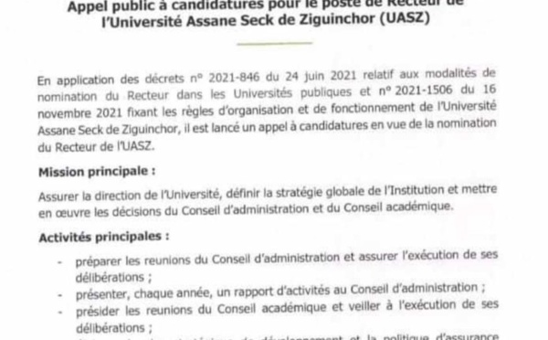 Le ministère de l'Enseignement supérieur, de la Recherche et de l'Innovation lance un appel public á candidature pour le poste de Recteur de l'Université Assane Seck de Ziguinchor (sud). Dans une note rendue publique ce 1er mai, l'autorité informe que la date limite de dépôt des dossiers de candidature est fixée au jeudi 30 mai...