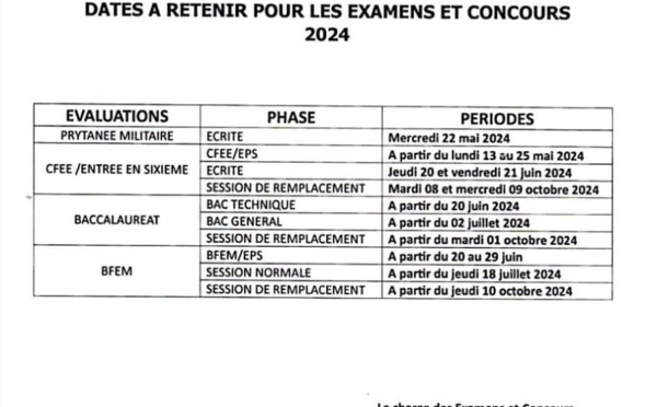 Le ministère de l'éducation nationale de l'enseignement supérieur de la recherche et de l'innovation vient de publier le calendrier des examens et concours 2024. La note est signée par le chargé des examens et concours, Sérigne Samba Mar. (Document)