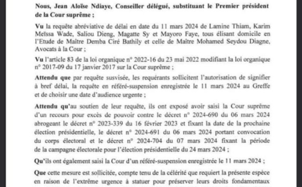 La Cour suprême répond au Front démocratique pour une élection inclusive (FDPEI) qui avait déposé lundi dernier un recours en annulation du décret convoquant le corps électoral pour le scrutin du 24 mars prochain. Elle autorise Karim Wade et ses alliés á assigner les parties à l’audience publique speciale de référé du vendredi...