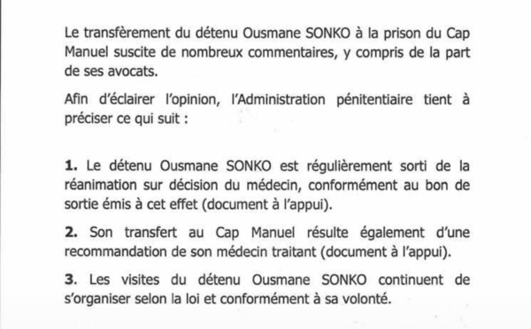Le ministère de la Justice vient de réagir à la polémique qui s’est installée ce mardi après le transfèrement de Ousmane Sonko au Cap Manuel. Alors que son avocat Me Clédor Ciré Ly par d’un enlèvement, les services dirigés par Aïssata Tall Sall affirment que tout a été fait en conformité avec les textes. « Le détenu Ousmane...