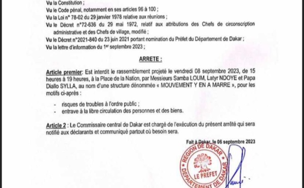 Le préfet de Dakar, Mor Talla Tine a interdit le rassemblement projeté le vendredi 08 septembre 2023, de 15 heures à 19 heures, à la Place de la Nation, au nom d'une structure dénommée « MOUVEMENT Y EN A MARRE ». Les motifs ci-après ont été évoqués: risques de troubles à l'ordre public et entrave à la libre circulation des...